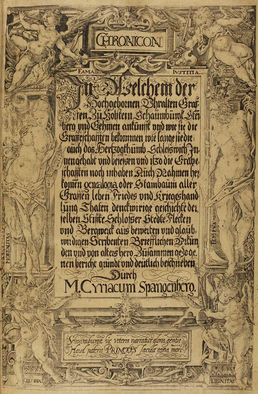Spangenberg, Cyriacus: Chronicon In Welchem der Hochgebornen Uhralten Graffen Zü Holstein Schaümbürgk Ster[n]berg und Gehmen ankünfft [...] wie lange sie [...] das Hertzogthümb Schlesswich Innen gehabt [...] Aüch Nahmen herkom[m]en genealogia oder Stambaüm aller Graffen leben Friedes und Kriegeshandlüng Thaten [...] deütlich beschrieben. Stadthagen : Fürstliche Druckerei, 1614.