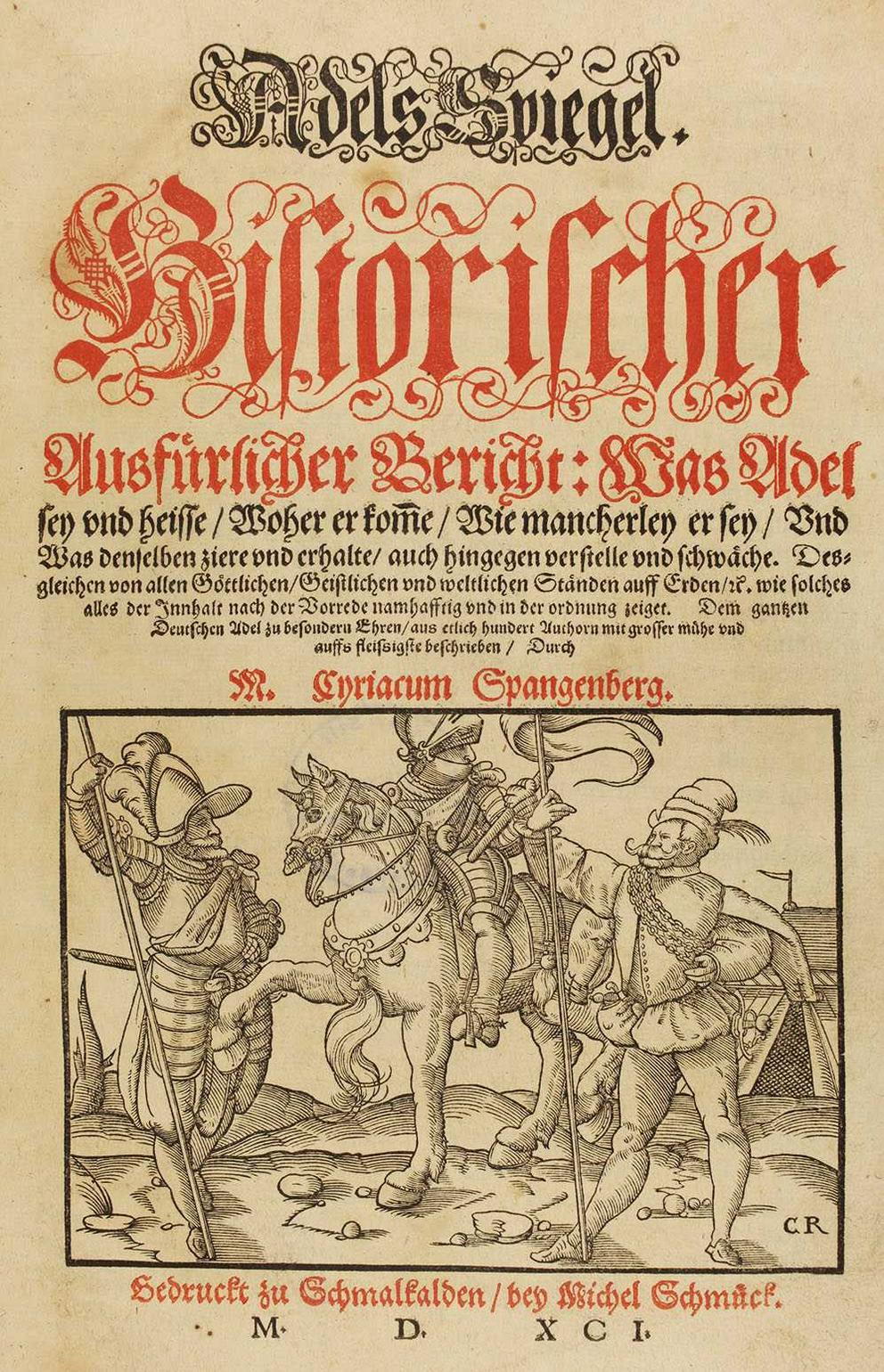 Cyriacus Spangenberg war nach dem Theologiestudium in Wittenberg als Pfarrer in Mansfeld tätig. Wegen theologischer Streitigkeiten musste er Mansfeld Anfang der 1580er Jahre verlassen und floh nach Straßburg. In Straßburg verfasste er, weiterhin unterstützt von den Mansfelder Grafen, von denen einer Kanoniker in Straßburg war, zahlreiche Auftragswerke für adlige Gönner, wie z. B. die »Mansfeldische Chronica« (1572), die »Sächssische Chronica« (1583), die »Querfurtische Chronica« (1590), den »Adels Spiegel« (1591), die »Hennebergische Chronica« (1594) und das nach seinem Tode erschienene »Chronicon [...] der Hochgebornen Uhralten Graffen Zü Holstein Schaümbürgk« (1614). Aufgabe dieser Schriften war die Legitimierung der Adelsherrschaft: entweder des Adels im Allgemeinen, wie im »Adels Spiegel«, oder der einzelnen Geschlechter wie in den Chroniken. Der »Adels Spiegel« war das einflussreichste Adelstraktat seiner Zeit. Das ausgestellte Exemplar stammte aus dem Besitz des Eislebener Stadtvogts Friedrich Bräutigam (um 1606/1620), dessen Bücher in der Bibliothek der Franckeschen Stiftungen überliefert sind und auf dem Einband das Wappen der Grafen von Mansfeld tragen.